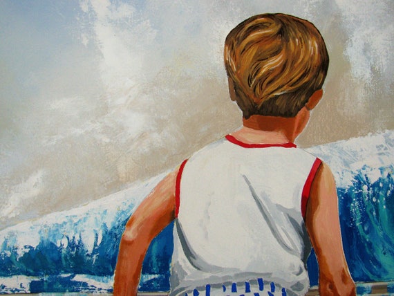 Global Warming Rising Waters Waves Stairs Red Shoes Storm Little Boy Original Oil Painting Wall Art 22x28 Free Shipping In Usa